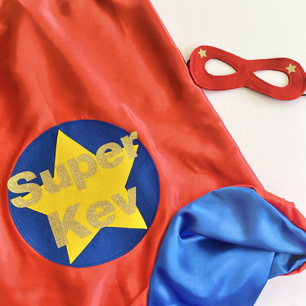 Adult Felt Super and Name Cape. Choose from Flash or Star Decoration
